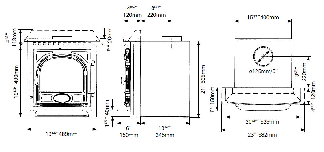 Flue outlet: 128mm (5”) top or rear