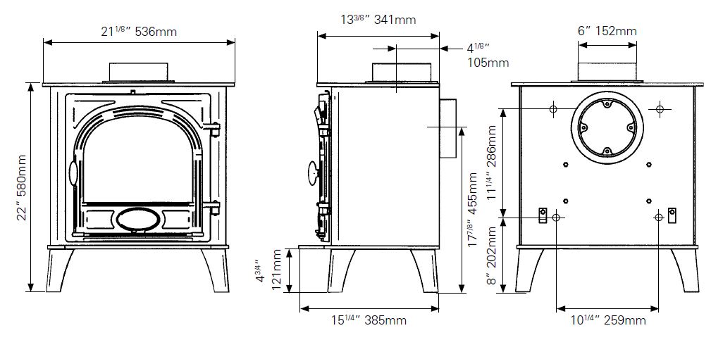 A very attractive centre piece, the Stockton offers substantial heating of up to 7kW output when burning wood or solid fuels and can take logs up to 325mm in length.