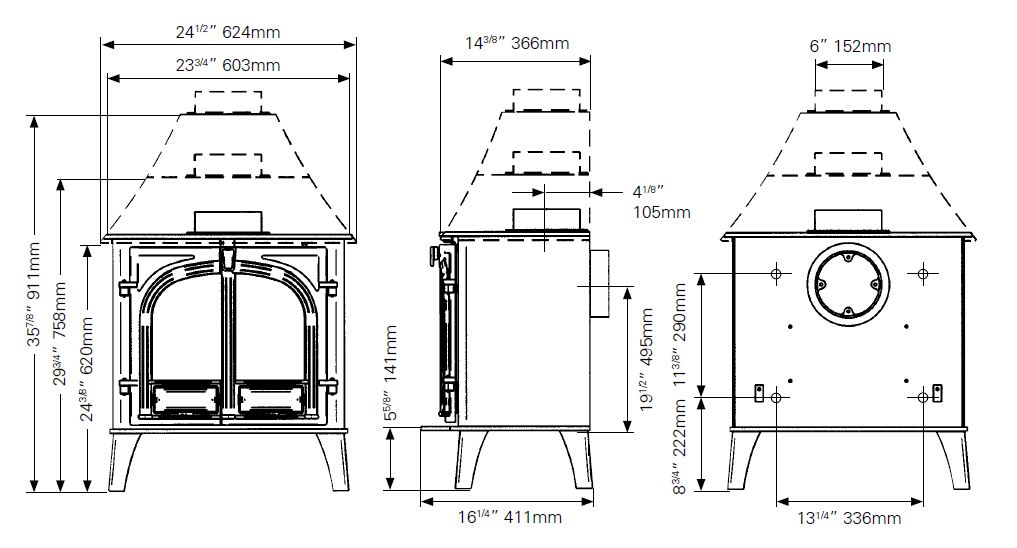 Stove dimensions – high canopy: 624 x 911 x 411mm (w x h x d)